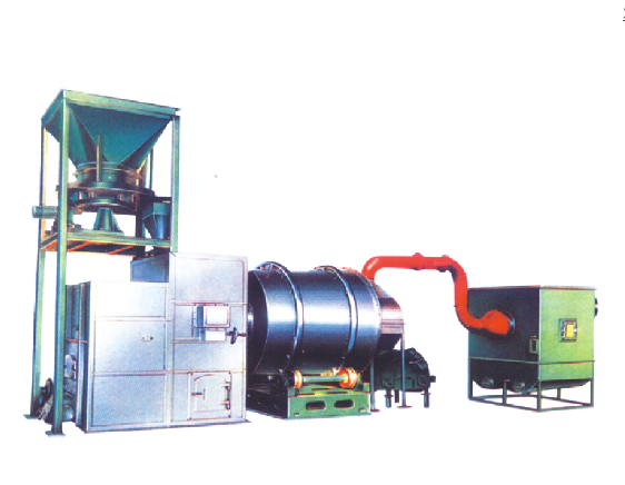 該裝置由翻斗加料機、斗式提升機、主傳動滾筒、燃燒爐、振動篩配以除塵抽風系統組成簡單的 烘砂單元,投資少、上馬快、經濟效益好。
